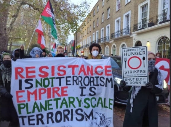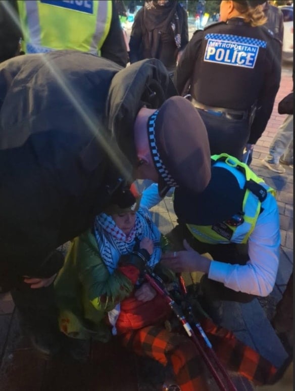 Despite short notice, scores of protesters supported Tuesday's heavily policed march through central London, carrying banners reading ‘Drop The Charges’ and ‘Resistance Is Not Terrorism.’ Local people came out to show their support along the route. According to witnesses, the policing was heavy-handed, with several marchers arrested, including an elderly woman on crutches who was reportedly tackled to the ground by police.