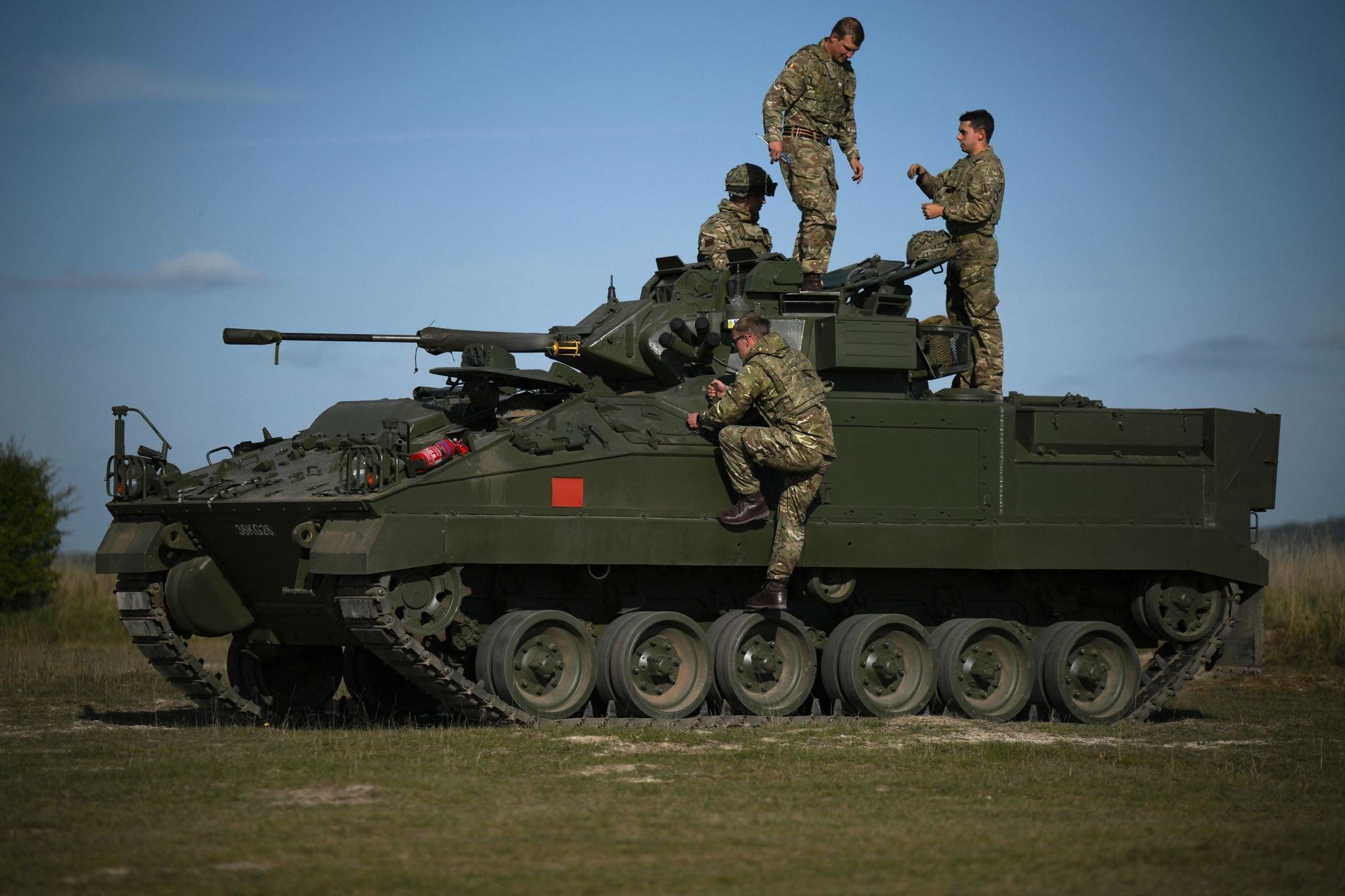 British military personnel mount a Warrior infantry fighting vehicle during a live fire combat training with Ukrainian recruits near Durrington, UK, October 11, 2022. (AFP)