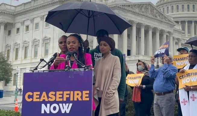 U.S. Rep. Summer Lee (D-Pa.) speaks in support of a Gaza ceasefire as Reps. Ayanna Pressley (D-Mass.) (left) and Ilhan Omar (D-Minn.) (right) look on outside the US Capitol in Washington, D.C. on October 20, 2023. (Summer Lee/X)