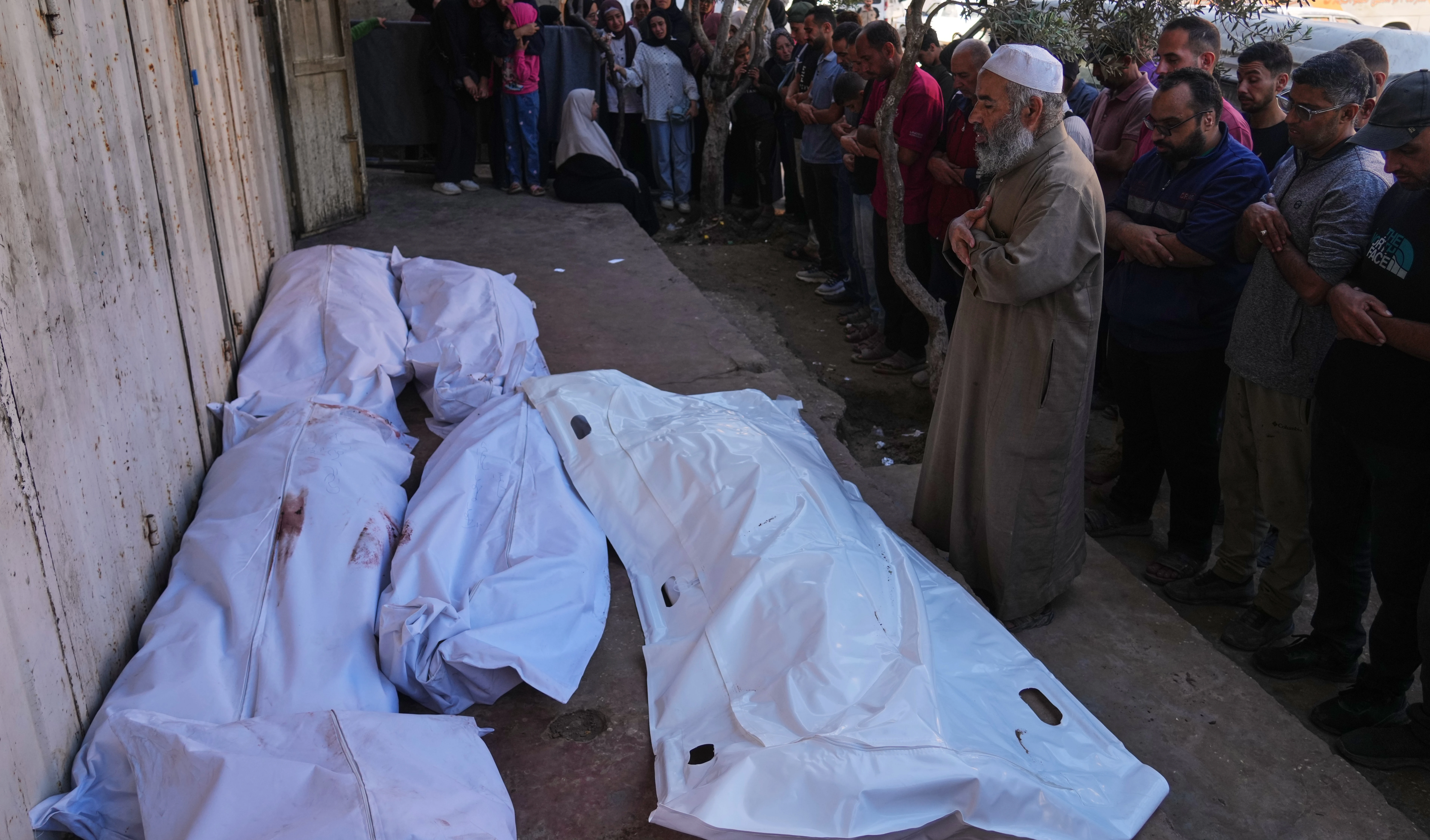 The bodies of several members of the Abu Mahdi family, killed in an Israeli army airstrike, lie on the floor at the Indonesian hospital in Beit Lahia, northern Gaza Strip, Monday, April 28, 2025. (AP)