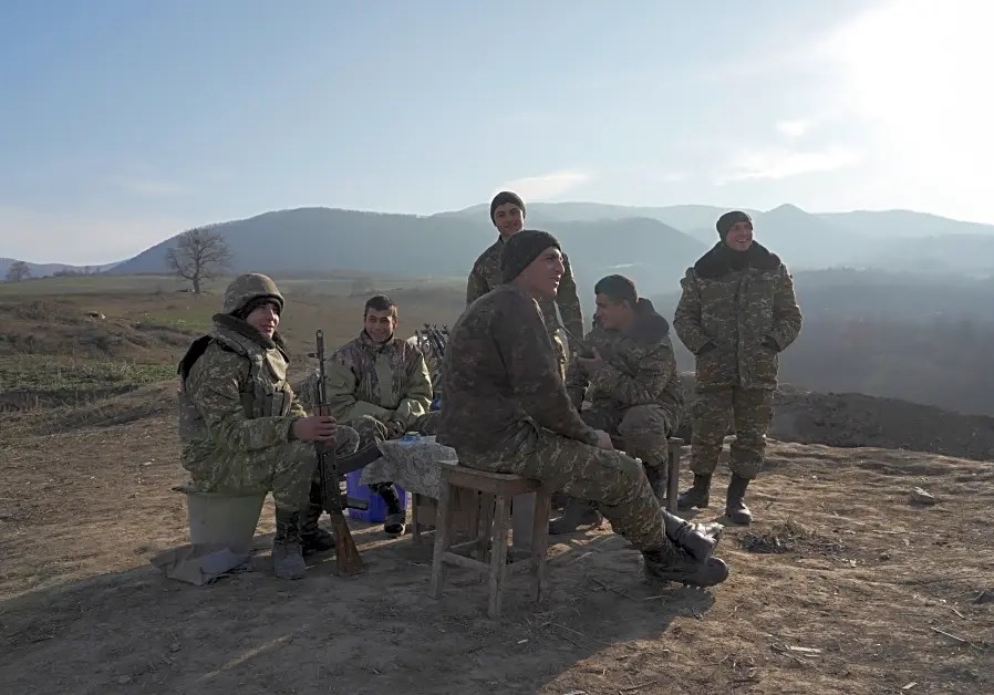 Armenian soldiers gather at their fighting positions near the village of Taghavard in the region of Nagorno-Karabakh, January 11, 2021 (Reuters)