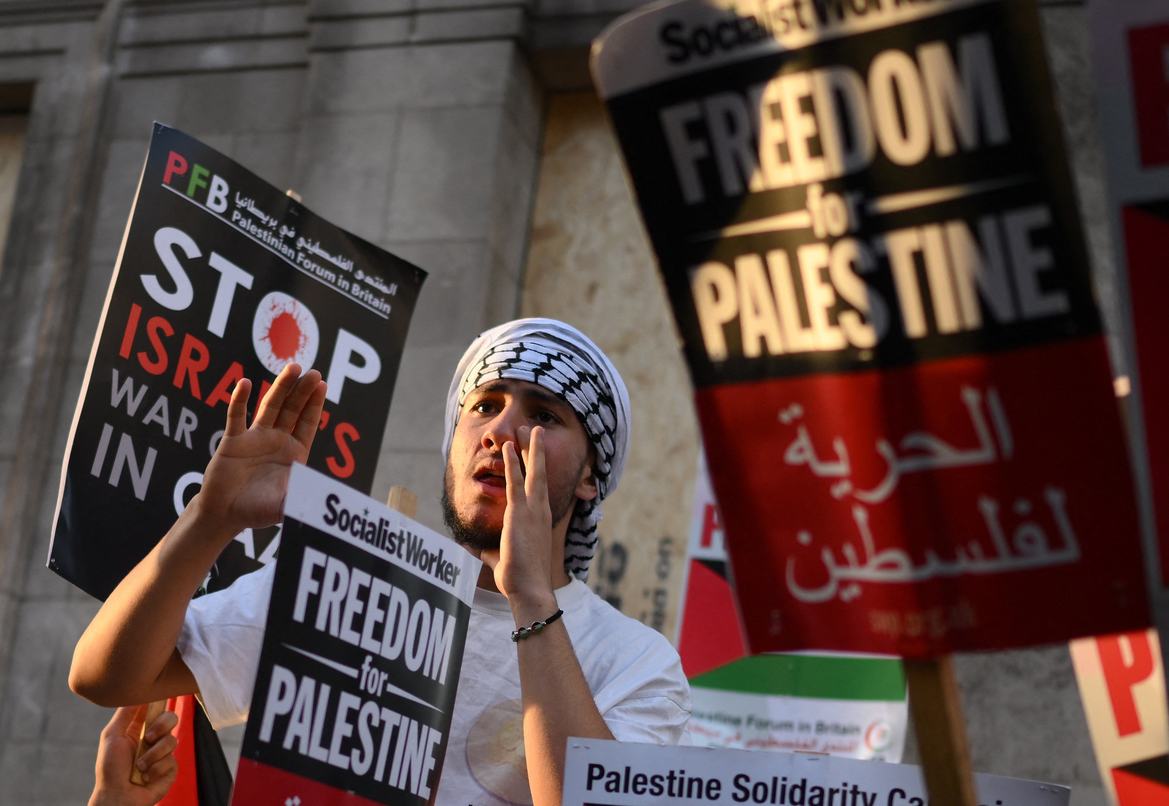 People take part in a "Stand with Palestine" demonstration, close to the Embassy of "Israel", in west London on October 9, 2023. (Daniel LEAL/AFP)