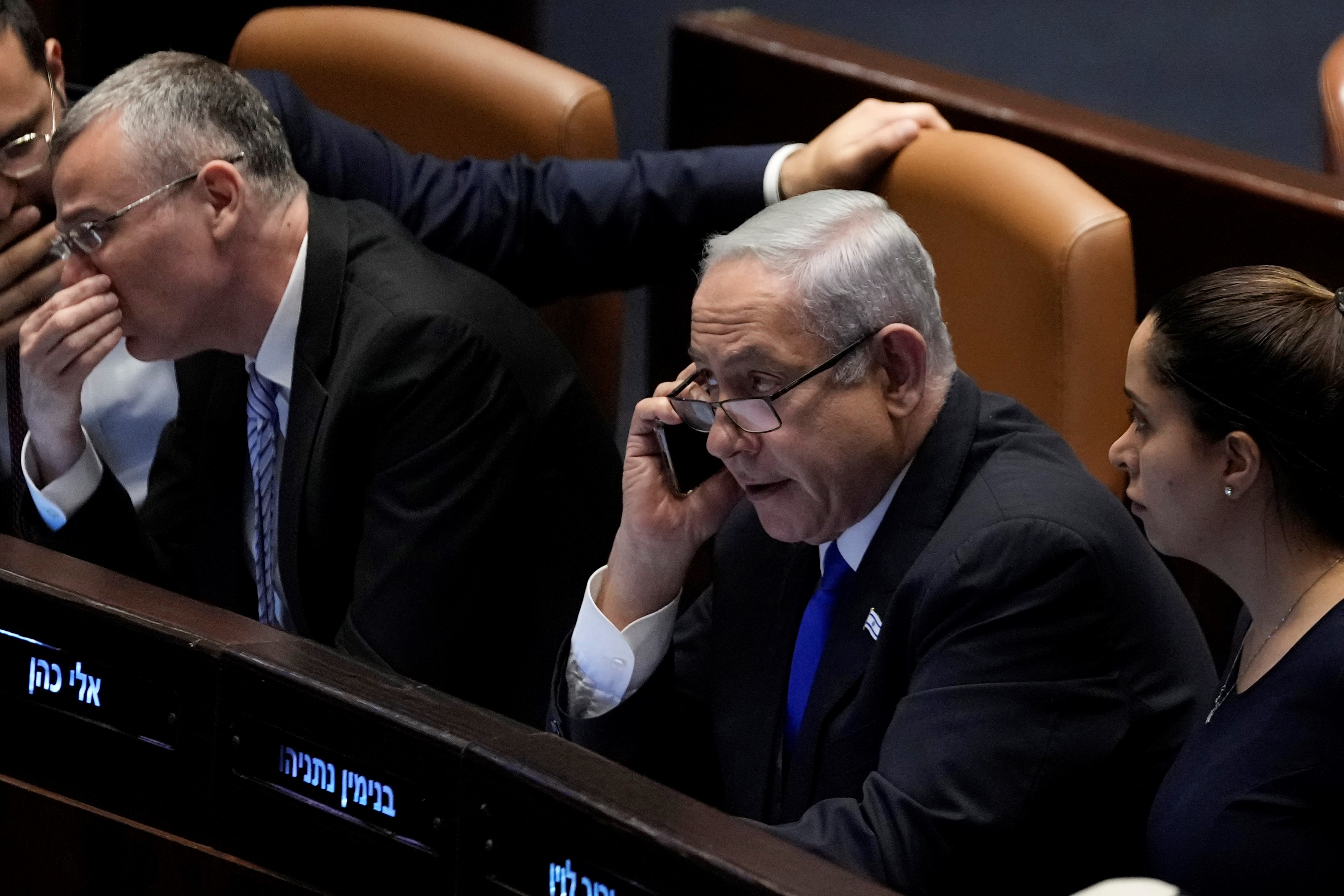Israeli Occupation Prime Minister Benjamin Netanyahu speaks on a mobile phone as he sits at the Knesset, in Al-Quds, Monday, July 10, 2023. (AP)