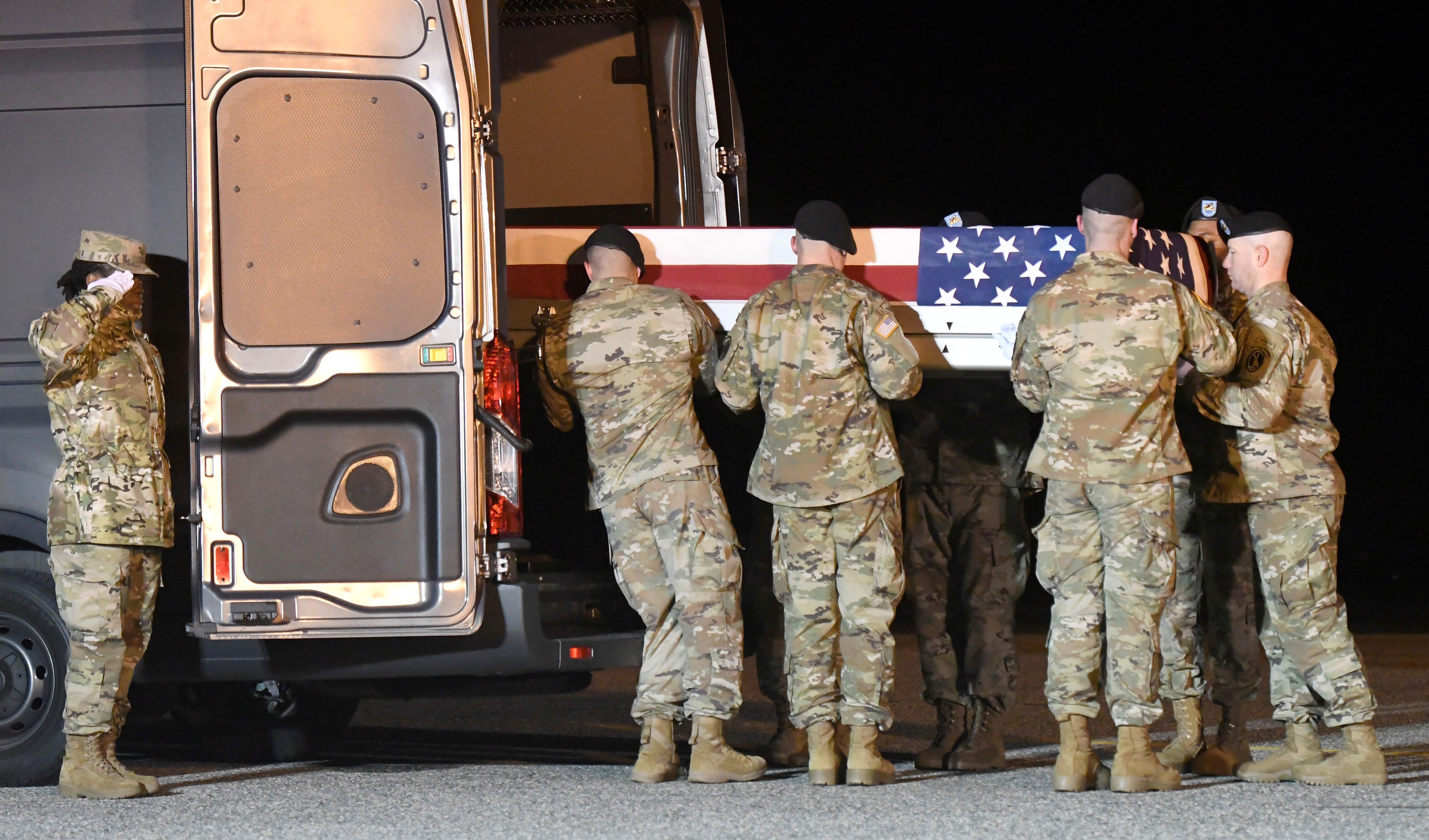 An Army carry team loads into a vehicle a transfer case containing the remains of Spc. Antonio I. Moore, Tuesday, Jan. 28, 2020, at Dover Air Force Base, Delaware after being killed in Deir Ezzor province, Syria. (AP)