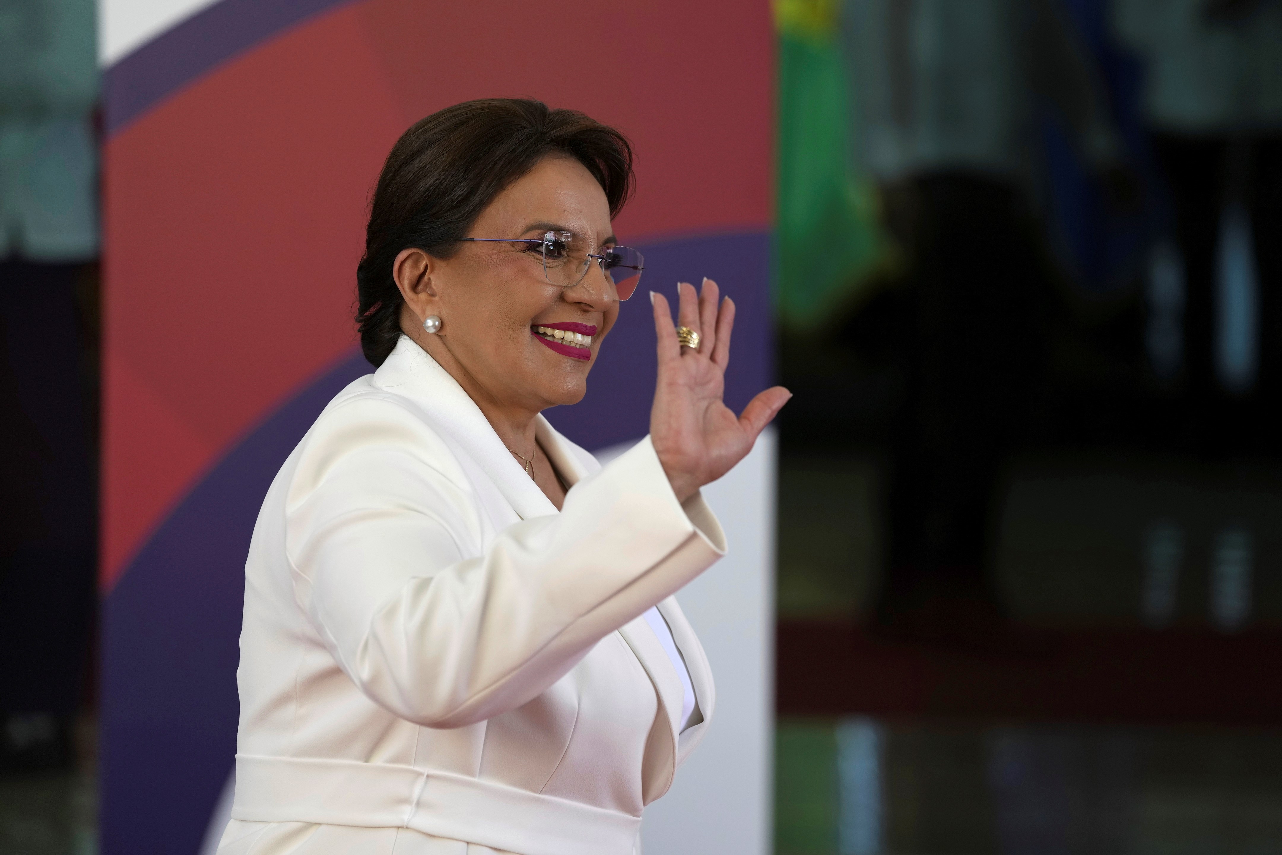 President of Honduras Xiomara Castro waves upon her arrival at the 28th Ibero-American Summit session, in Santo Domingo, Dominican Republic, Saturday, March 25, 2022. (AP)