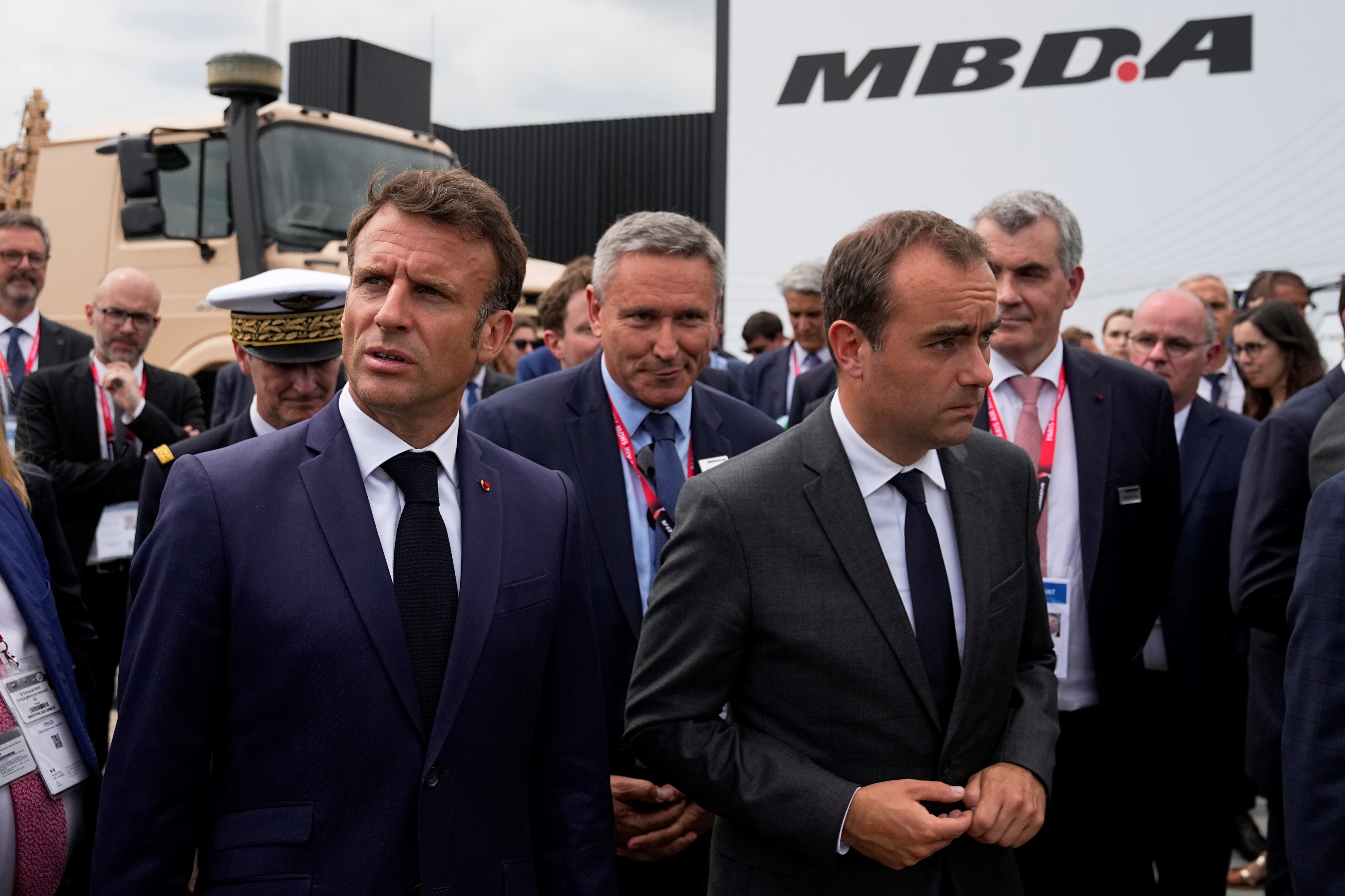 French President Emmanuel Macron, left, flanked by French Defense Minister Sebastien Lecornu visits the International Paris Air Show, Monday, June 19, 2023, in Le Bourget, north of Paris (AP)