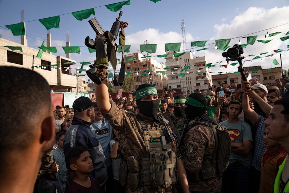 A Palestinian Resistance fighter from al-Qassam Brigades holds a rifle seized from Israeli occupation forces during an arms show for the group at the Nuseirat refugee camp, central Gaza Strip, Palestine, on June 30, 2023. (AP)