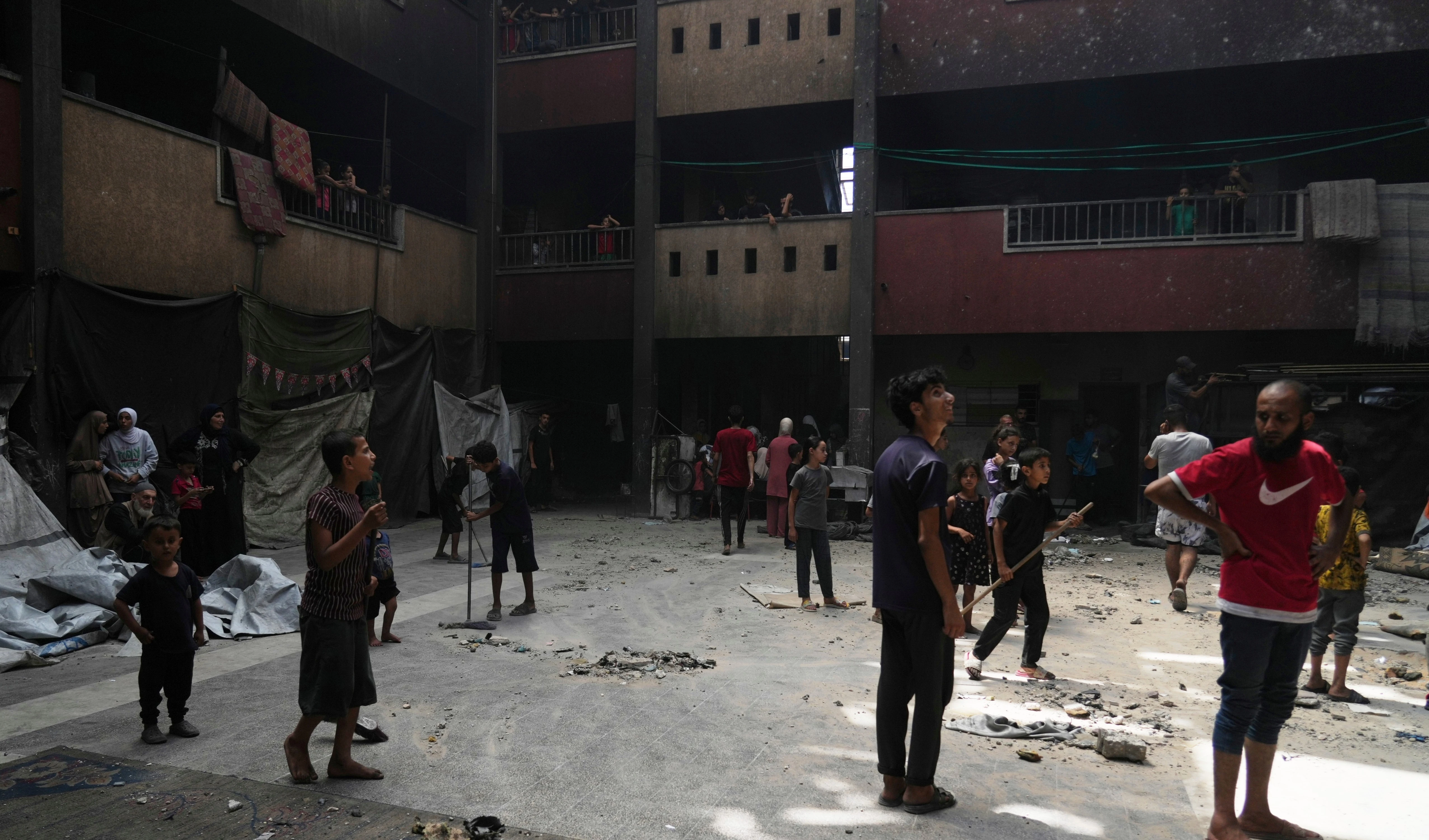Children play outside Royce Hall at the University of California, Los Angeles, campus in Los Angeles, August 15, 2024 (AP)
