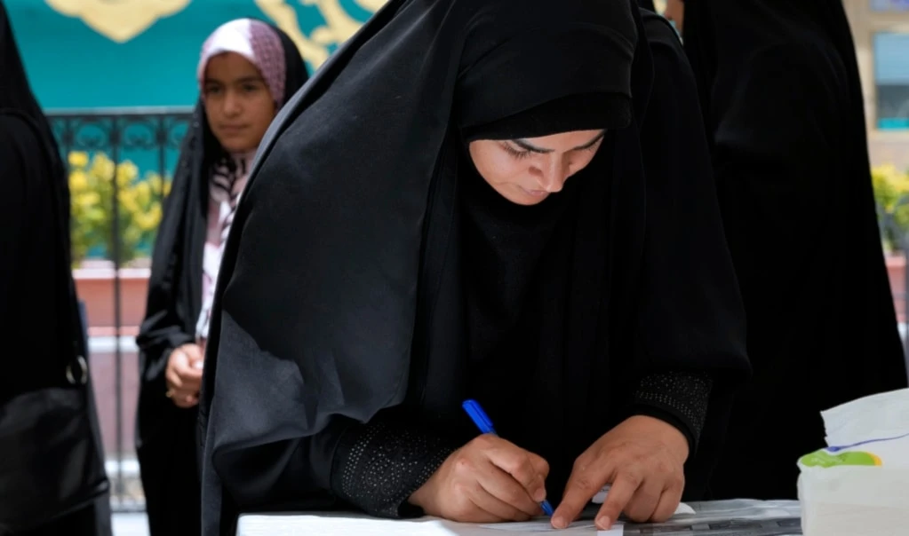 An elderly woman uses a magnifying glass to fill out her ballot for the presidential election at a polling station in Tehran, Iran, June 28, 2024 (AP)