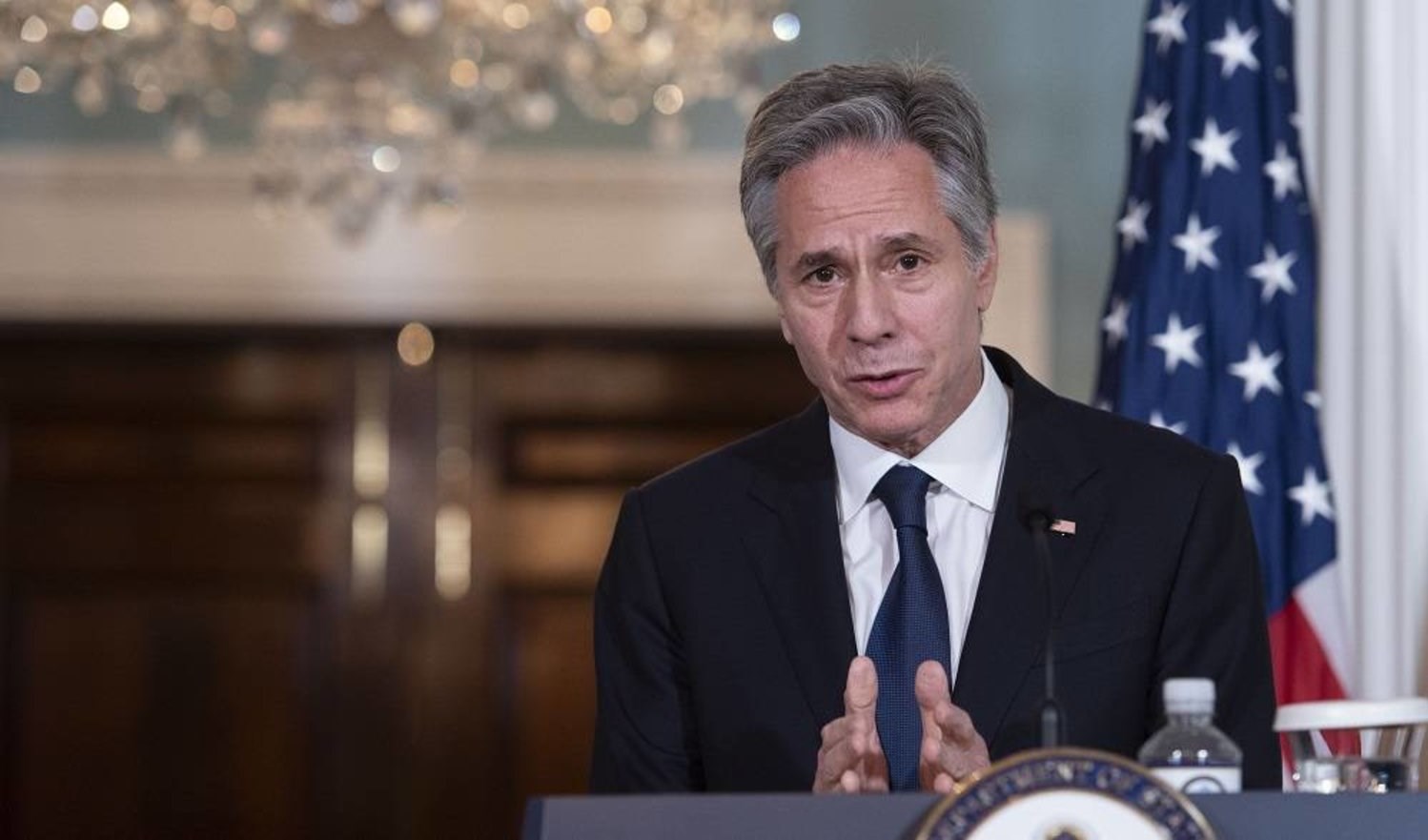 Secretary of State Antony Blinken speaks with reporters after meeting with Mexican Foreign Secretary Alicia Barcena at the State Department in Washington, Thursday, Aug. 10, 2023 (AP)