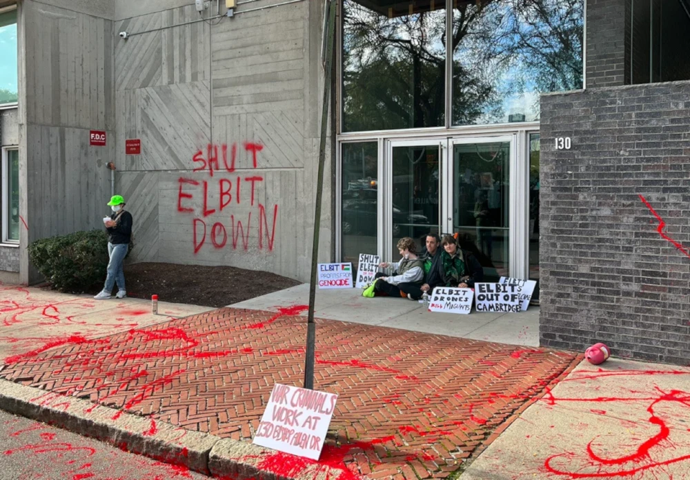 Palestine solidarity activists shut down the Elbit Systems office in Cambridge, Massachusetts, in October 2023. ( @Pal_action / X)