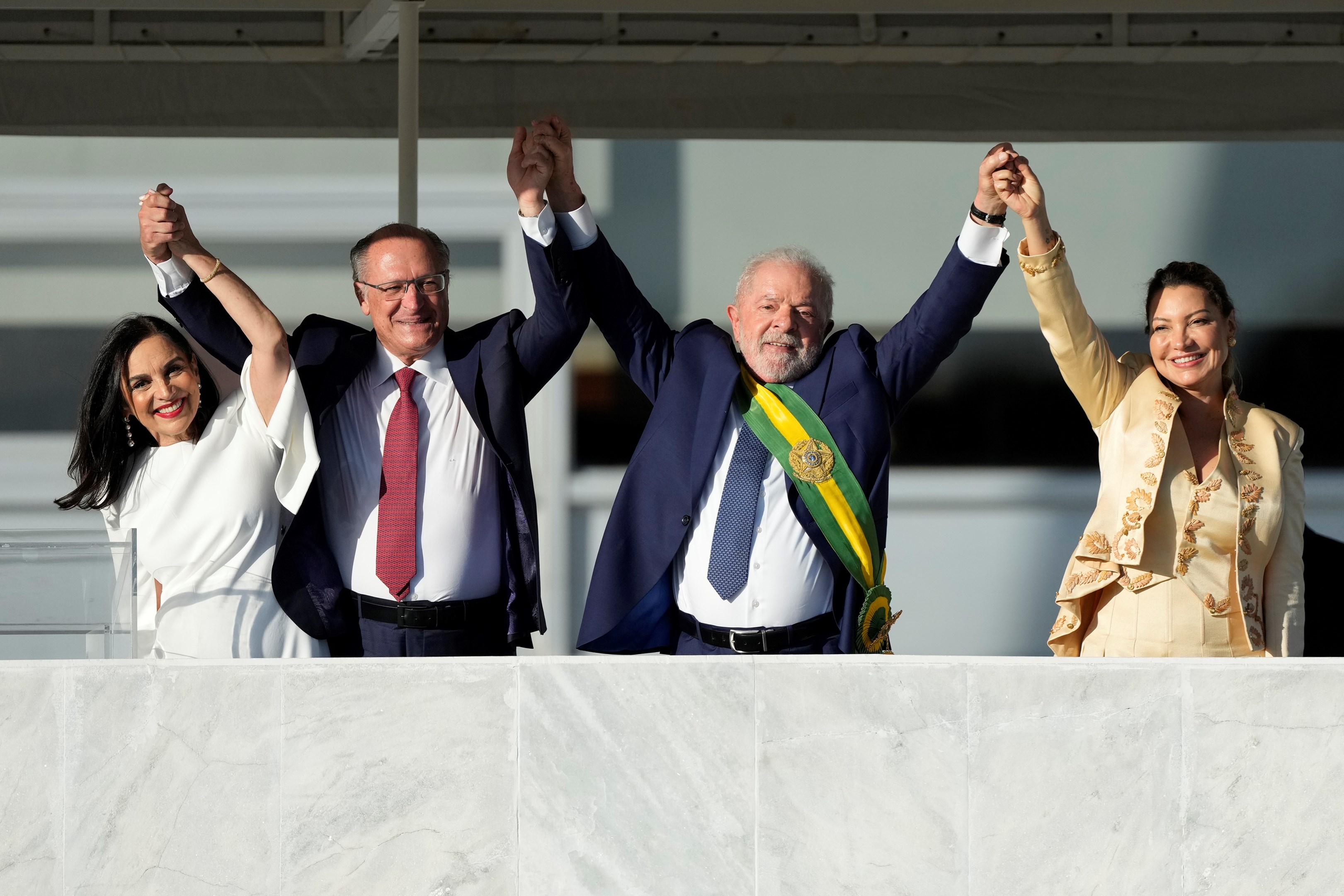 President Luiz Inacio Lula da Silva, second right, his wife Rosangela Silva, right, Vice President Geraldo Alckmin, second left, and his wife Maria Lucia Ribeiro hold hands at the Planalto Palace in Brasilia, Brazil, Sunday, Jan. 1, 2023 (AP Photo/Silvia Izquierdo)