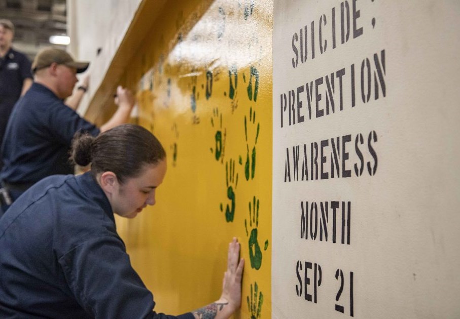A US Navy member puts her handprint on the transport dock ship USS Green Bay in recognition of Suicide Awareness Month (US Navy)