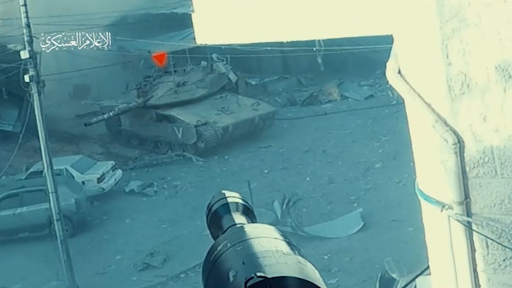 A screengrab from a video published by the military media of the Al-Qassam Brigades depicting the destruction of an Israeli Merkava-4M (Military Media)