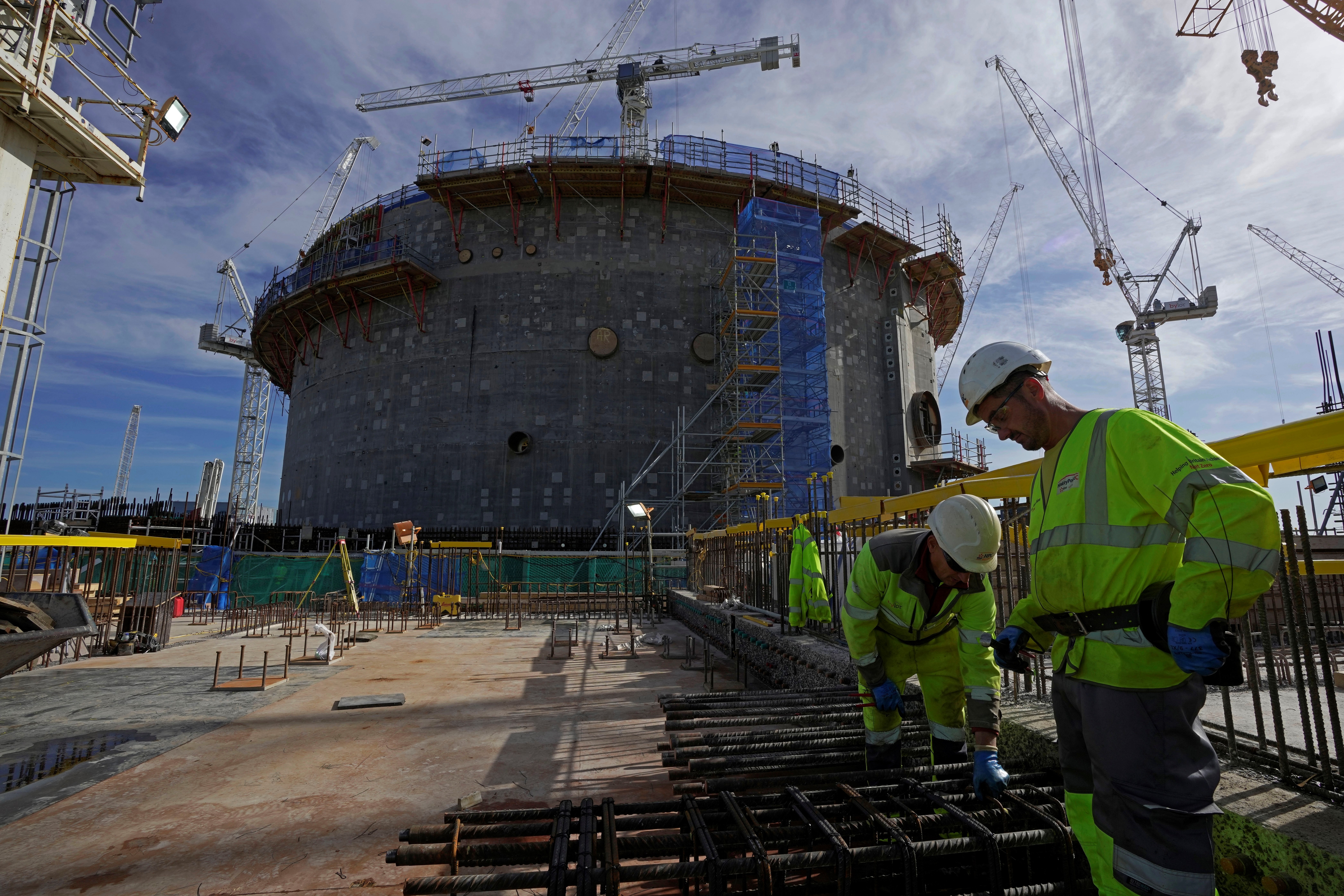 Employees work at the construction site of Hinkley Point C nuclear power station in Somerset, England, Tuesday, Oct. 11, 2022 (AP Photo/Kin Cheung)