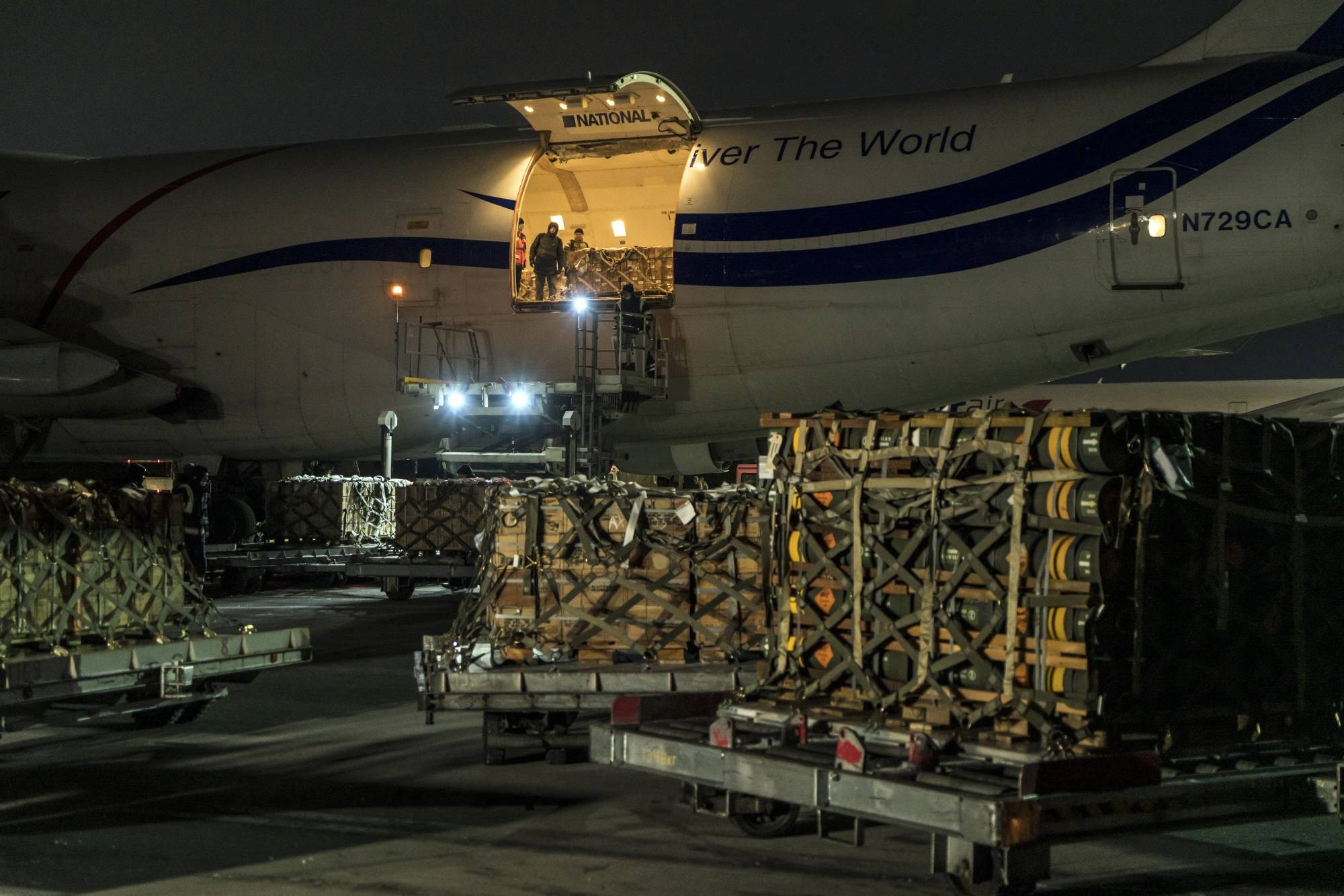 A shipment of equipment and defensive munitions from the United States arrives at Boryspil Airport, just outside Kiev, on January 25