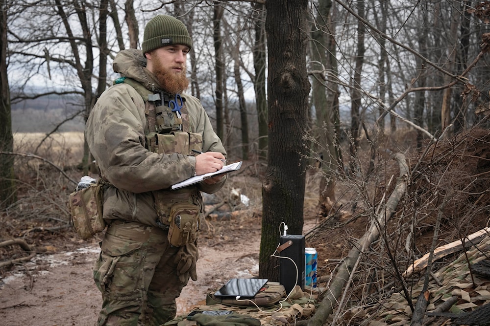 An officer of 12th Special Forces Brigade Azov of the National Guard writes down coordinates to fire a 155mm self-propelled gun M109 Paladin near Kreminna, Lugansk, on January 28, 2024. (AP)