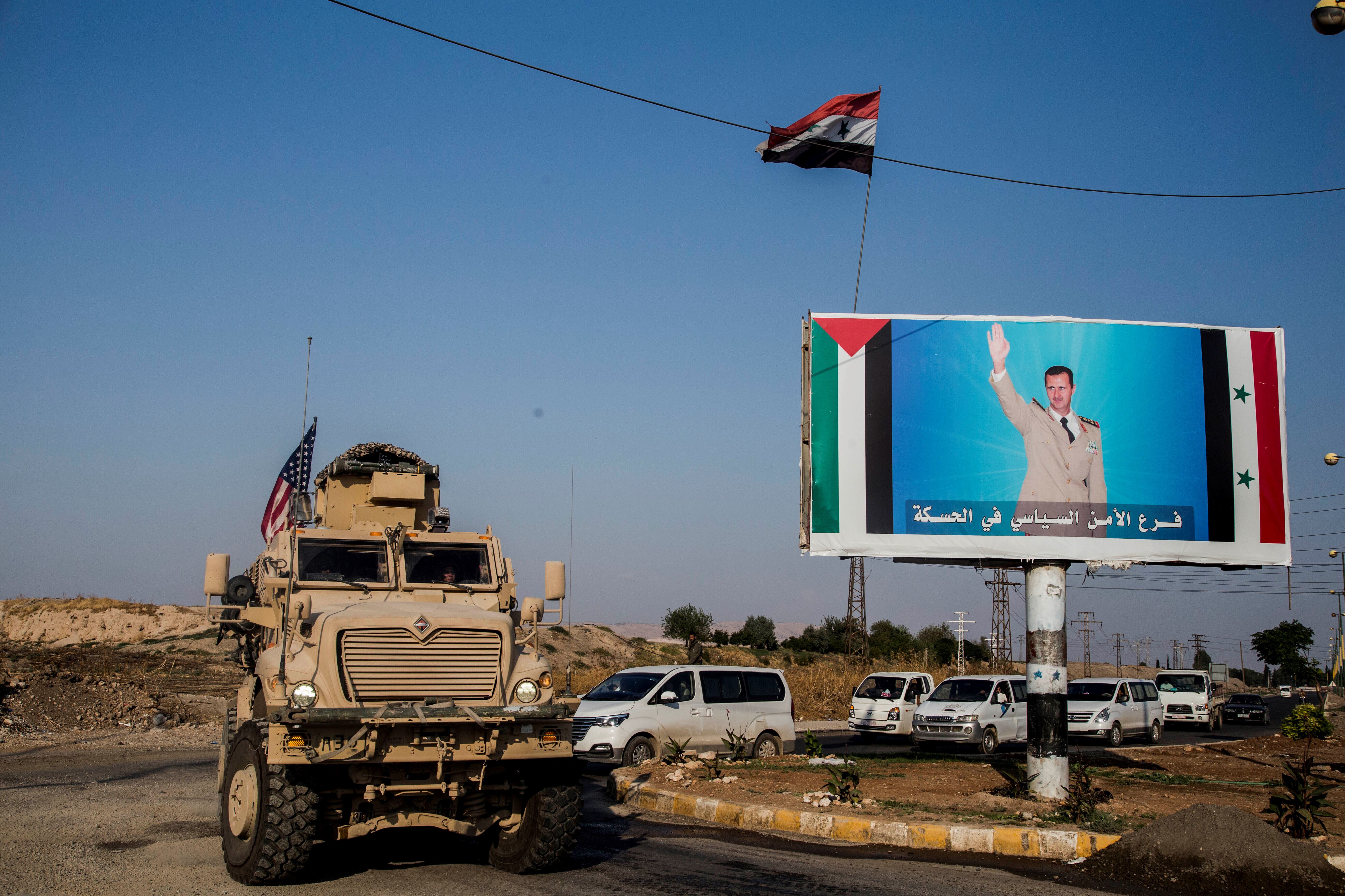 In this October 26, 2019 file photo, US military convoy drives in the town of Al Qamishli, northern Syria, by a poster depicting Syrian President Bashar Aassad. (AP)