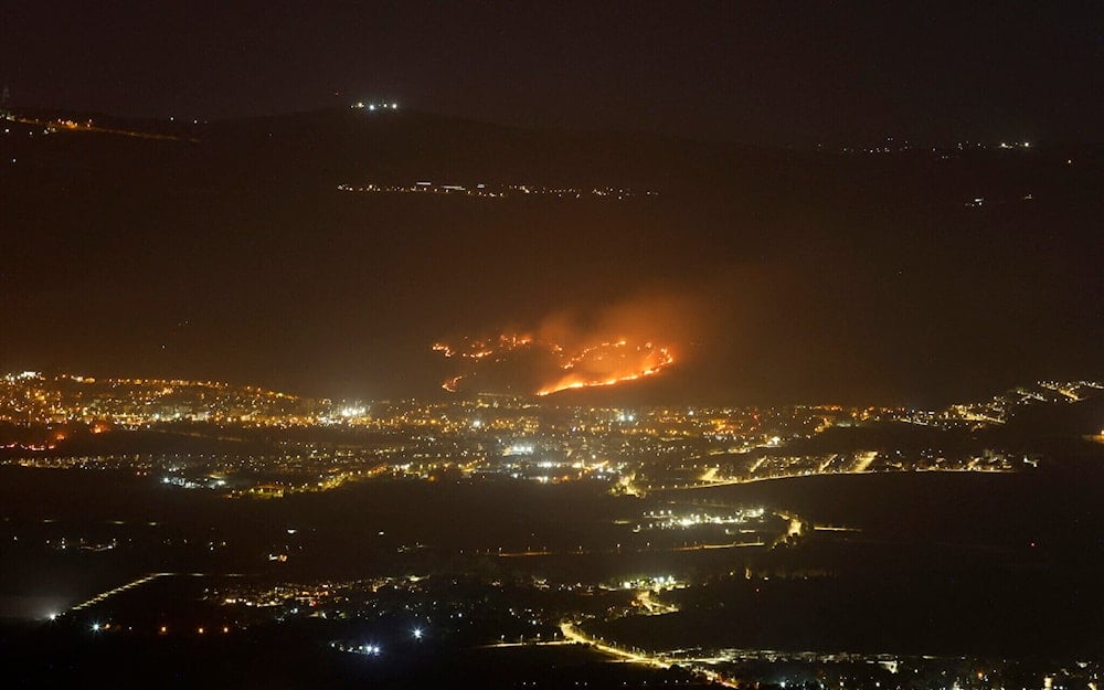 A fire broke out as a result of rockets launched from Lebanon, next to the northern settlement of Kiryat Shmona, on May 10, 2024. (AFP)