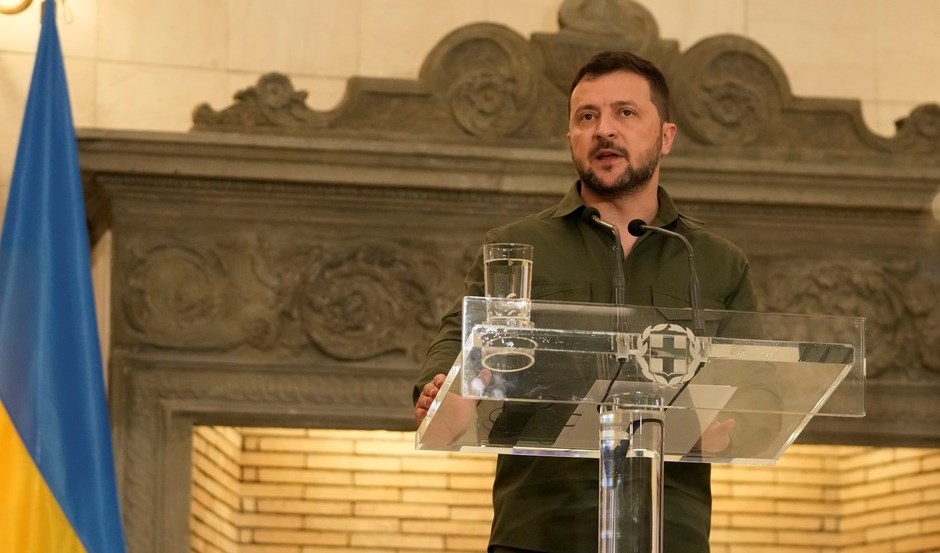 Ukraine's President Volodymyr Zelensky speaks during a joint news conference with Greece's Prime Minister Kyriakos Mitsotakis at Maximos Mansion in Athens, Greece, Monday, Aug. 21, 2023 (AP)
